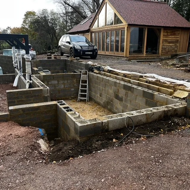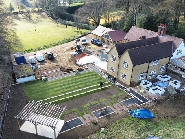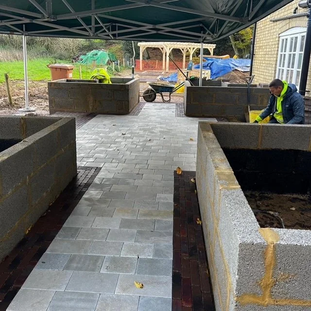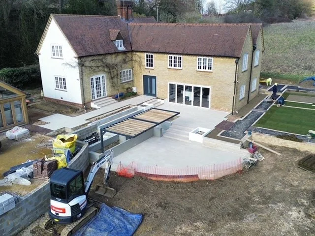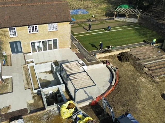 Split level paving, retaining wall and pond construction, resin bound pathways, rendered planters and soft landscape finishes.